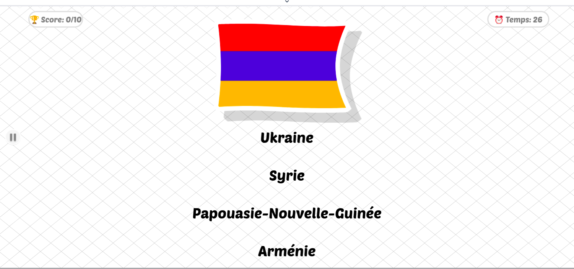 Dans GeoFlag, les patients doivent deviner le nom d'un pays en identifiant son drapeau parmi quatre choix proposés. À chaque tour, un drapeau est affiché, accompagné de quatre pays, dont un seul correspond au drapeau présenté. Ce jeu est idéal pour stimuler la mémoire visuelle, l'attention et la réflexion rapide. Il est spécialement conçu pour renforcer les capacités cognitives des patients et favoriser leur rééducation motrice grâce à l'interaction tactile avec l'écran.