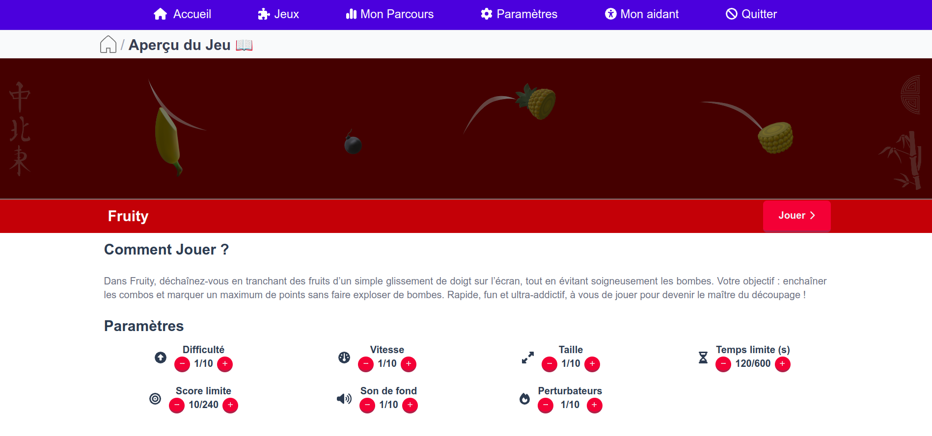 Dans Fruit Slash, tranchez des fruits d'un simple geste sur l'écran tout en évitant les bombes ! Votre objectif : enchaîner les combos et marquer le maximum de points tout en testant vos réflexes et votre agilité. Ce jeu rapide et fun est un excellent entraînement pour améliorer votre coordination œil-main, votre vitesse de réaction et vos compétences motrices.