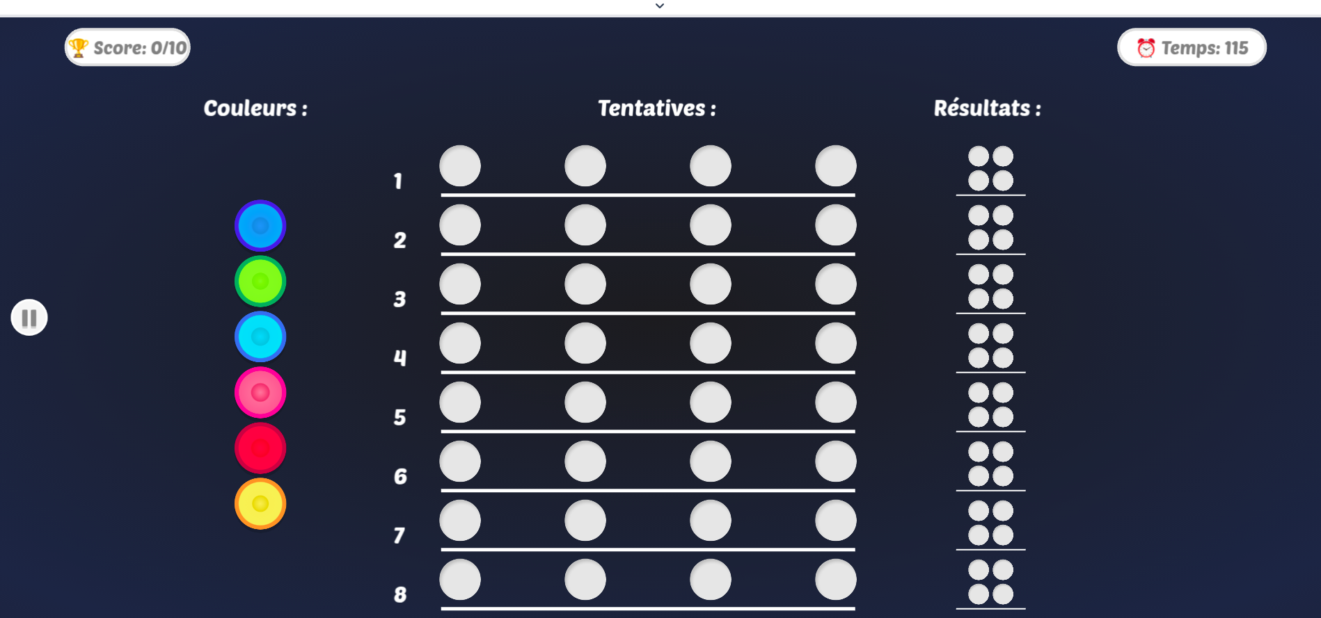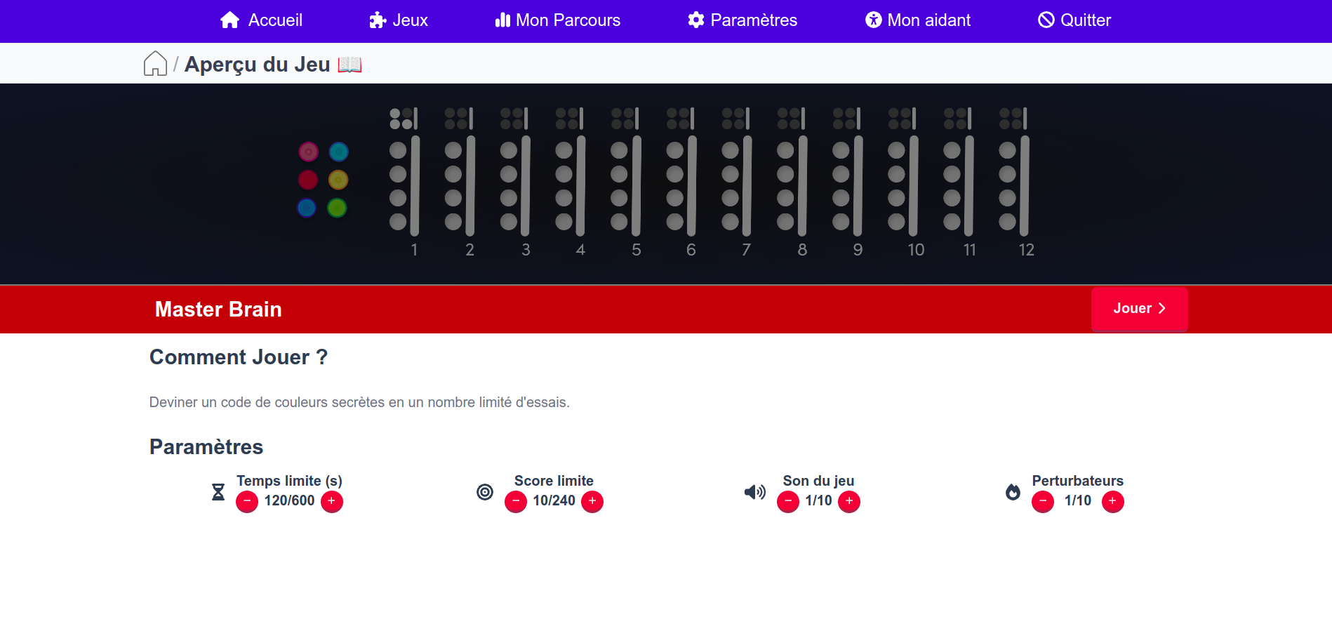 Master Brain est un jeu de logique et de mémoire dans lequel le joueur doit deviner un code de couleurs secret en un nombre limité d’essais. Chaque tentative fournit des indices pour ajuster les choix suivants. Ce jeu stimule les fonctions exécutives, la planification mentale, la mémoire de travail et la concentration, tout en engageant la motricité fine grâce à l’écran tactile.