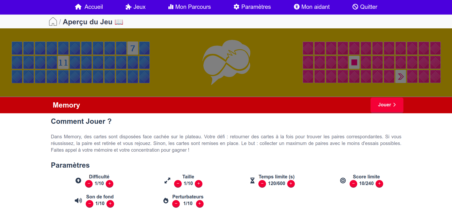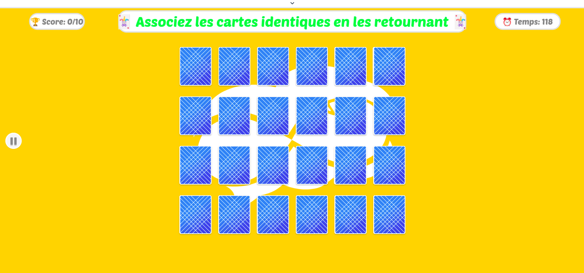 Dans Memory Cards, des cartes sont disposées face cachée sur le plateau. Votre mission : retourner les cartes pour trouver les paires correspondantes. Si vous réussissez, la paire est retirée et vous rejouez. Sinon, les cartes sont remises en place. Le but est de collecter un maximum de paires tout en minimisant le nombre d'essais. Ce jeu est parfait pour entraîner votre mémoire, votre concentration et améliorer vos capacités cognitives.