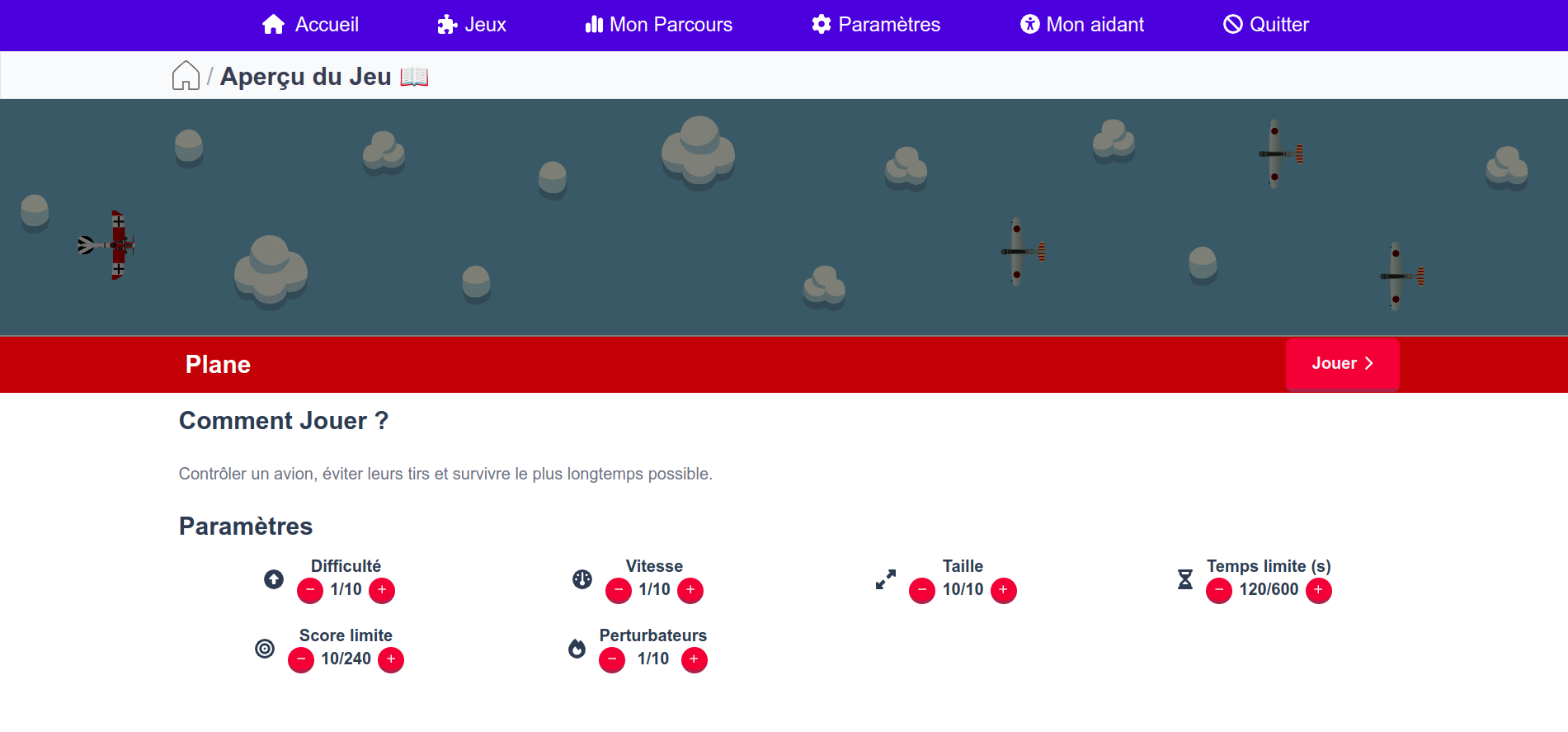 Dans Sky Survivor, prenez les commandes d'un avion et évitez les tirs ennemis tout en survivant le plus longtemps possible. Ce jeu sollicite votre réflexe, votre coordination motrice et votre réactivité, vous mettant au défi à chaque instant. Idéal pour la rééducation cognitive, Sky Survivor permet de renforcer l'attention et la concentration tout en vous offrant une expérience palpitante.