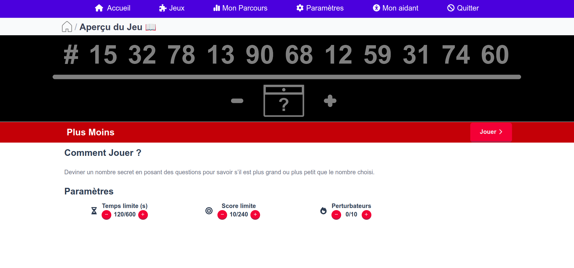 Nombre Mystère est un jeu de déduction tactile où le joueur doit retrouver un nombre secret en interrogeant l’écran : “plus grand ?” ou “plus petit ?”. Cette activité renforce la mémoire de travail, le raisonnement logique et la concentration, tout en sollicitant la coordination œil-main.