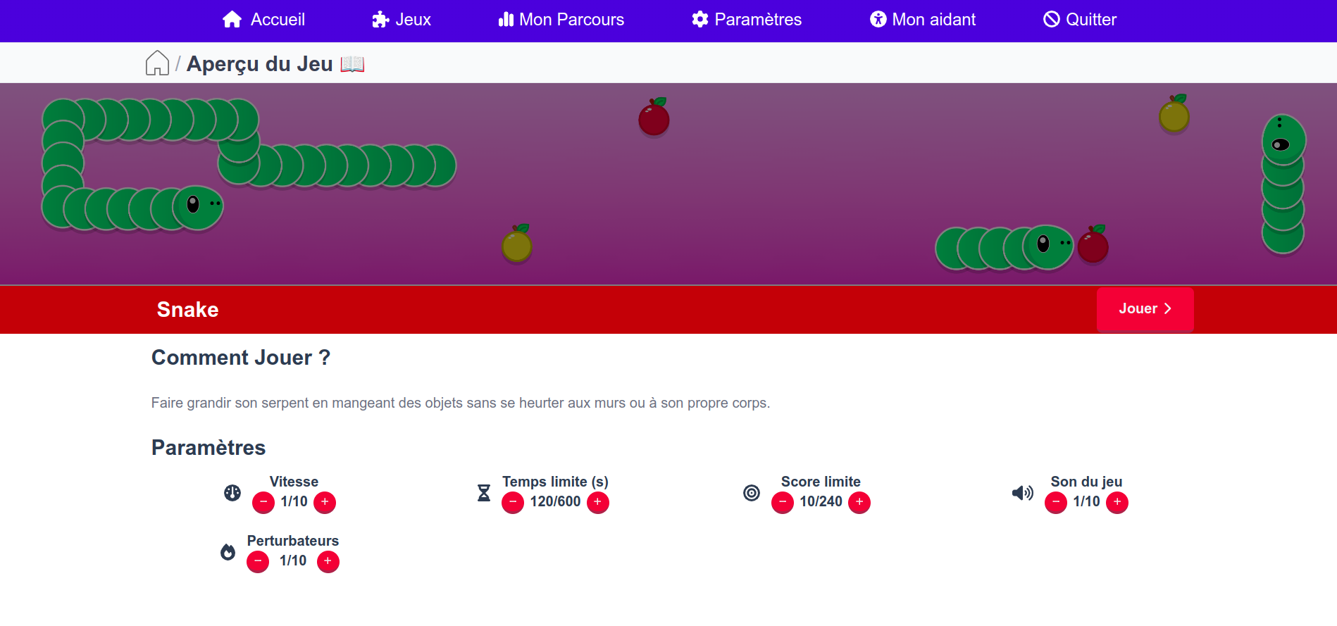 Dans Snake Rush, guidez votre serpent pour manger des objets qui apparaissent à l'écran, tout en évitant les murs et votre propre corps. À chaque objet mangé, votre serpent grandit, rendant l'aventure de plus en plus intense. Ce jeu est idéal pour travailler la coordination motrice, les réflexes et la réactivité, tout en étant un excellent outil de rééducation cognitive pour améliorer la concentration et l'attention.